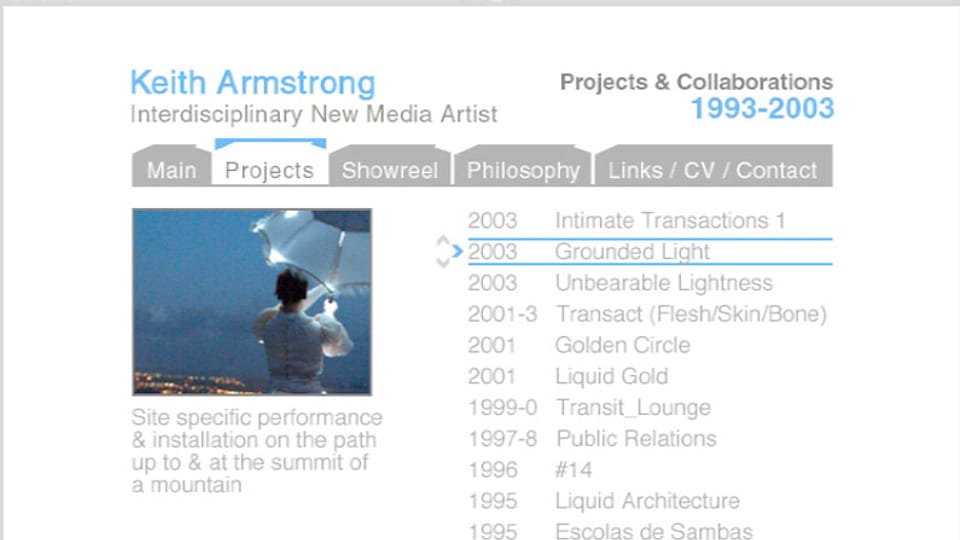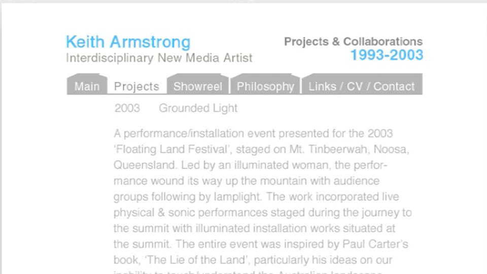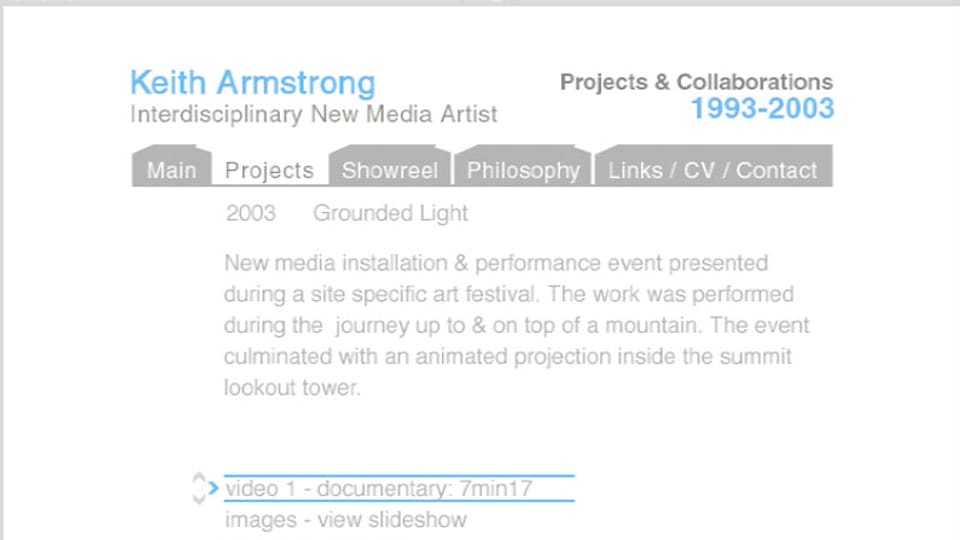 The full scope of my practice from 1993–2003 in edited video documentaries, image slideshows, animations, text and high quality sound. (2003), 120 mins. approximately. This is a self-published title.