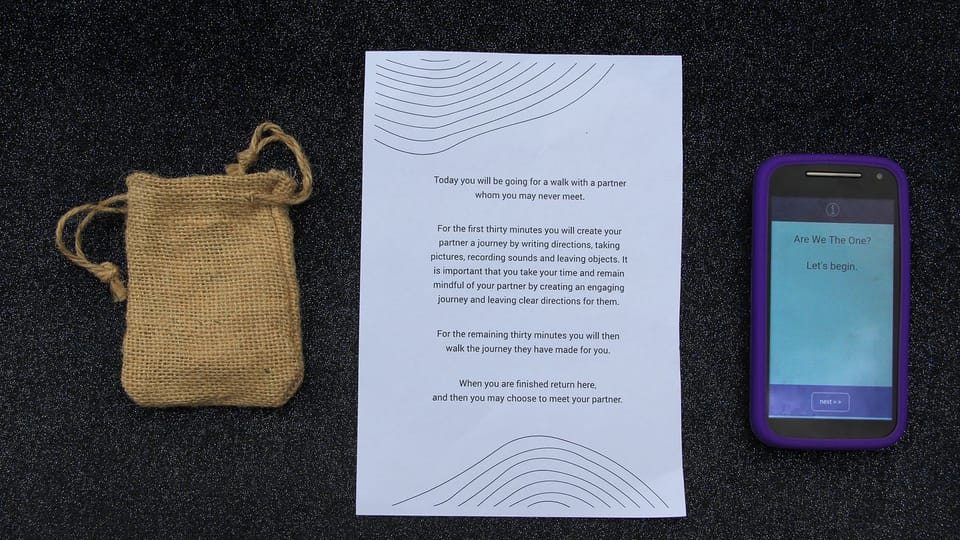 A collaborative, performative and relational experience for two people, woven together by a custom digital phone App. Two walkers, who have never met, simultaneously use a phone App to record a personalised walk around their locality, crafting a series of special moments and surprises for each other. The App then allows participants to continue their two walks, but now directed by what the other person has just created for them. Finally, at the end of the experience they can then choose whether they would like to actually meet in person.