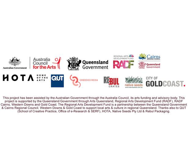 Between 2019-23 this project was assisted by the Australian Government through the Australia Council, its arts funding and advisory body. It was also supported by the Queensland Government through Arts Queensland, Regional Arts Development Fund (RADF). The Regional Arts Development Fund is a partnership between the Queensland Government: Cairns Regional Council; Western Downs Regional Council; City of Gold Coast Council; Somerset Regional Council; and ArtsCoast as part of Sunshine Coast Council’s RADF program to support local arts and culture in regional Queensland.