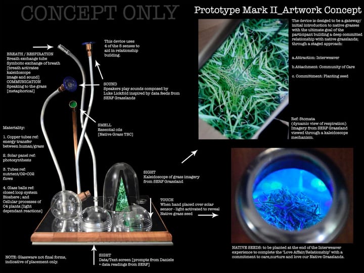 Stage 1 of the project was enacted over a 5-month period in 5 Queensland locations (Cairns, Miles, Gold Coast, Sunshine Coast and Somerset). Each site involved the establishment and care of a local iconic native grass planting/artwork comprised of two species, with species tailored to that local bioregion (Oct-2022-Feb 2023). At each site we engaged with local community members and consulted with First Nations experts. Each location also had a principal carer/artist or team who received both a grass garden kit and an artwork called the ‘Interweaver’. The Interweaver’s functions were to: present ongoing images from the projects' remote grass garden (which contained the project's chosen 6 species) located in Samford, Qld and to provide inspirational prompts to the carers about their emerging experiences growing native grasses. These were delivered on printed cards prepared by the project's 'Grassland Community of Care Coordinator', in order to encourage a relationship building process between the carer(s) and their grasses. All sites of this distributed artwork were made visible to online audiences at www.carbondating.art. Through these processes a Queensland-wide Grassland community of care interest group was developed - which also came together to share resources at HOTA, Gold Coast in December 2022 for a First Nations led Yarning Circle.