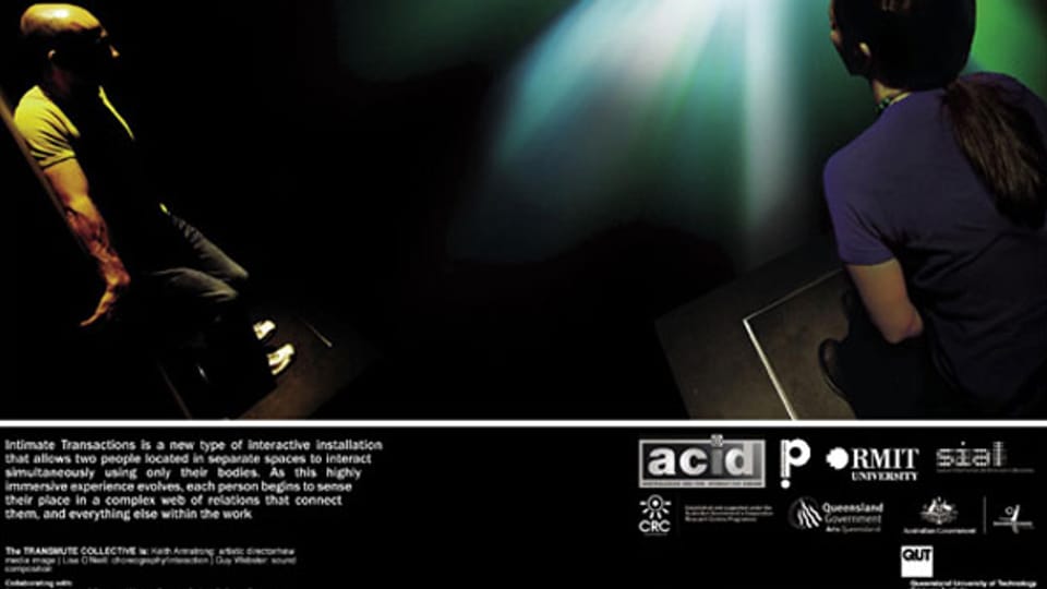 Intimate Transactions was a research project developed in three distinct stages and outcomes between 2003 and 2005. Stage 2 was a radical departure from Stage 1 (2003) and was developed and presented during 2004. It cross-fertlised knowledges of performance and media arts in order to create a range of highly embodied interactive experiences for participants. Its outcome was a dual site interactive installation allowing two people to interact within a complex, generative, audiovisual environment by simply shifting their balance of bodyweight and backpressure. This involved the design of an entirely new tangible interface system which, via the use of back and feet pressure, allowed participants to control this server-driven, telepresent software work.