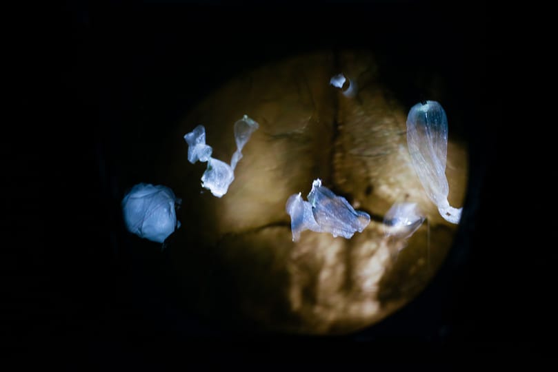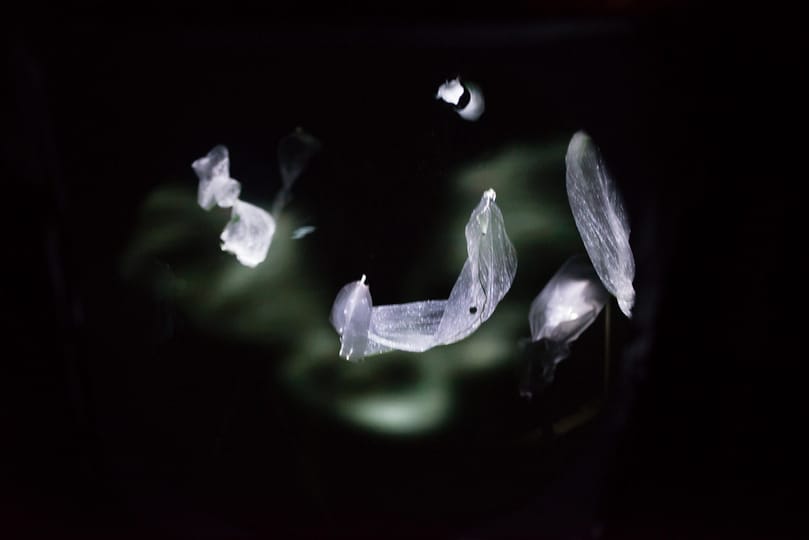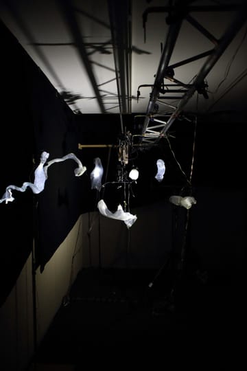 A new form of media installation combining image, multi-channel sound and internally lit objects into a mysterious, deep image plane. Staged on the very edge of spectrum blackout, and moving into the deep of night,