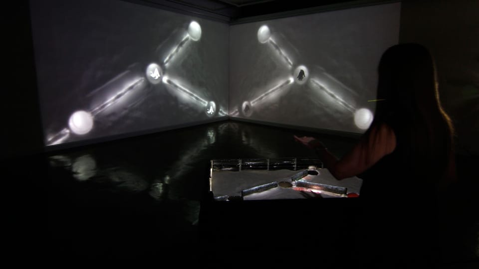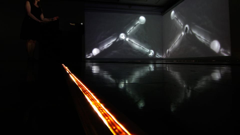 This led to the envisaging of a computational model that now drives the entire art work - driven by moving ‘creatures’ - each of whom embody qualities of a particular ecologist’s responses around ‘pitfall avoidance’. These ‘creatures’ are suggested by animated imagery, infrared light and 3D sound, that 'circulates', and sometimes ‘collides’ with a representation of a pitfall trap line.