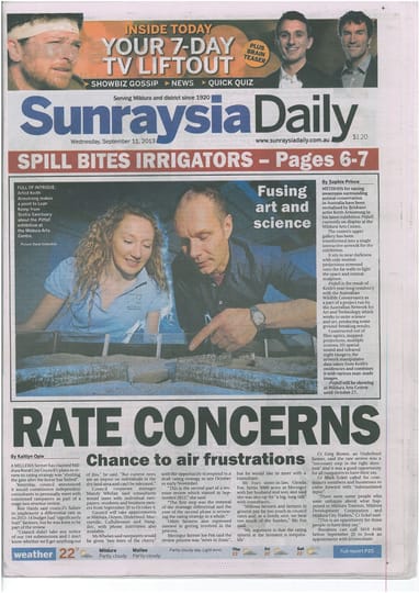 1: Pitfall, Mildura Art Centre, 199 Cureton Ave, Mildura, Victoria, Australia, 5th Sept-27th Oct, 2013. Opening 5th September at 7pm. {Mildura Palimpsest: Biennale #9, Site Specific Arts Biennial, Victoria}. Pitfall Catalogue. Front Page newspaper headline