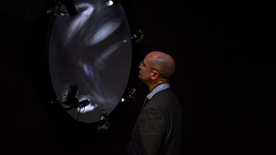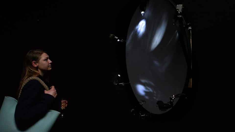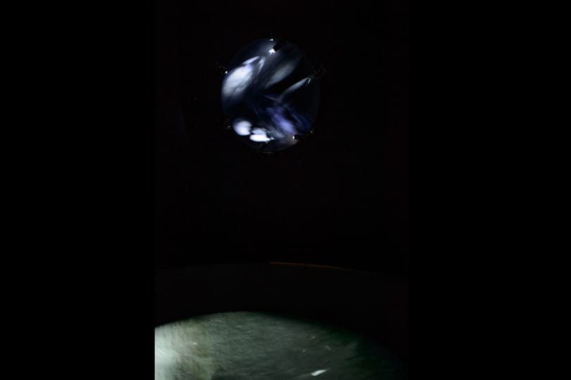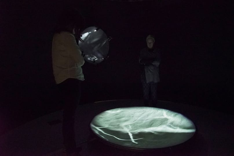 This interactive installation comprises a darkened circular room with a large circular dish/screen upon the floor, with multi-layer imagery of ultra-close up images of organic materials gliding across it, disappearing into the darkness. On the far wall another smaller oval dish has a series of diffused moving lights playing across it, accompanied by the sound of gently whirring motors. Each of these 3D-printed robotic light assemblies has organic materials mounted within its barrel, and through which light must pass, before it plays on the dish, causing complex, diffused revolving patterns. The sound track that travels around the perimeter of the room presents a mixture of found and processed nocturnal sounds of the South-Central Queensland/Australian bush at night, recorded during a time of seasonal change. Audience movements (disturbances) within the space are sensed and cause subtle changes in the video mixing, and in the sound mix’s layering and panning, and in the pace of the robotic motors, all of which are computer controlled.
