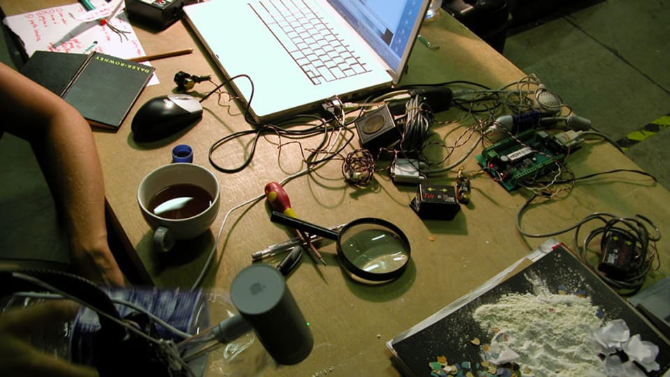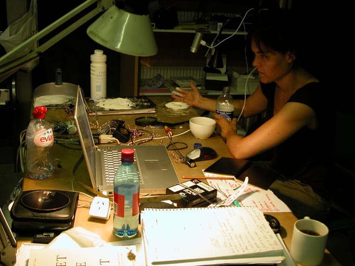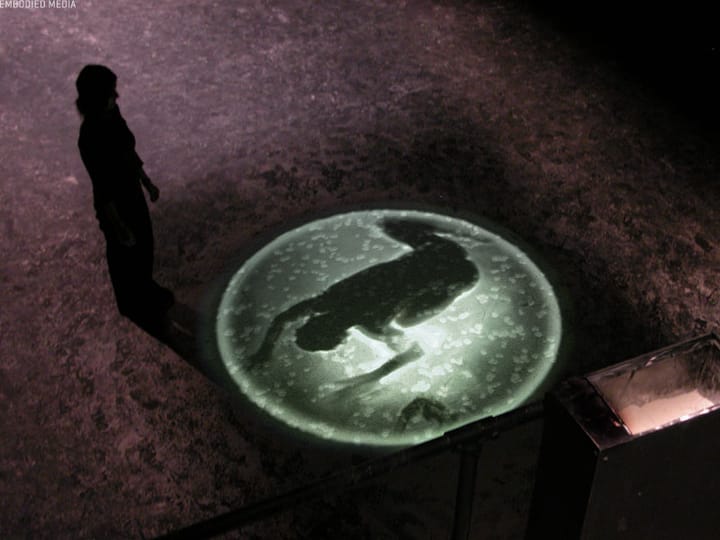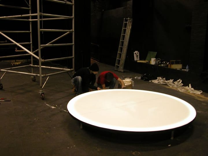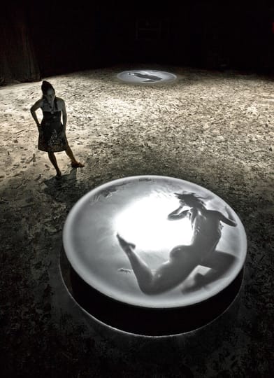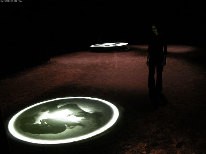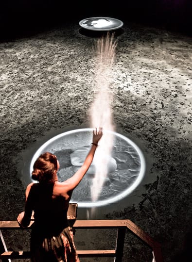 An interactive/media artwork for one person at a time. Each participant entered a large, dark space containing two circles of projected film imagery presented within an immersive sound environment. One image floated upon a disc of white sand and the other on a circle of white dust. Participants’ movements directed and affected the filmic image and spatialised audio experience. Throughout the work a layer of dust (an artificial life form) slowly ate away and infused itself deep into the imagery and sound. Each person had 10 minutes alone with the work. Their movement through the space continually affected speed, quality, balance and flow within the work. At the end of the experience they were invited to climb a lit platform and cast dust back onto the images below.