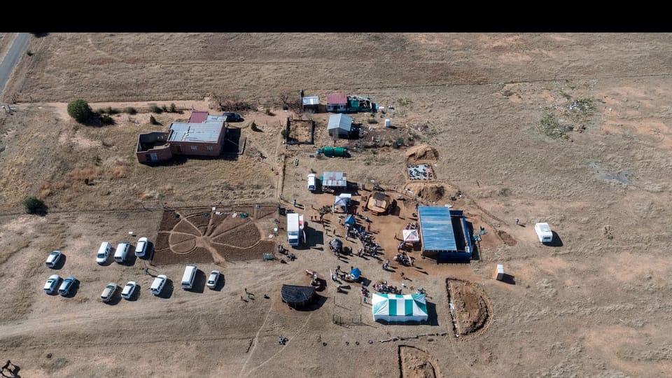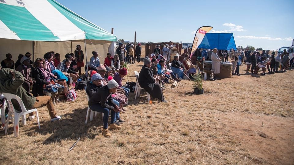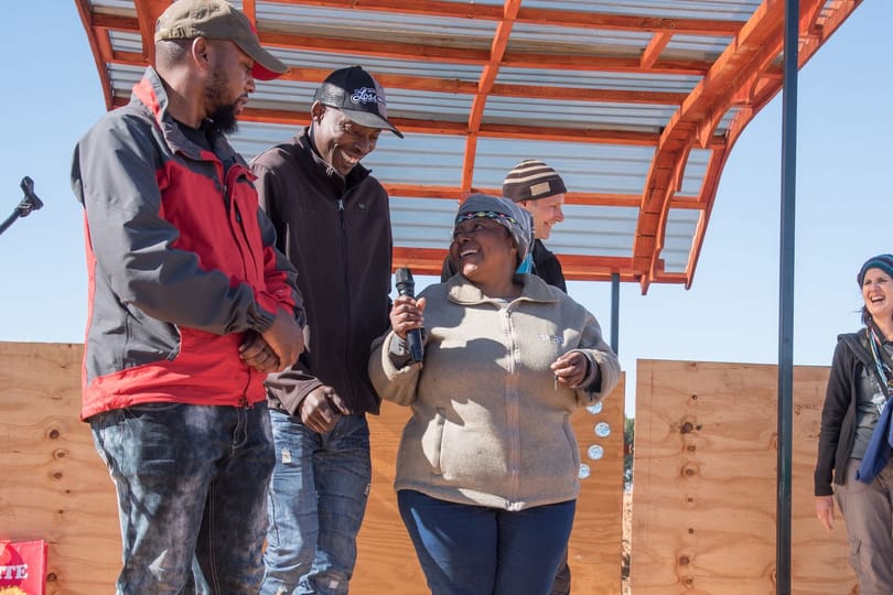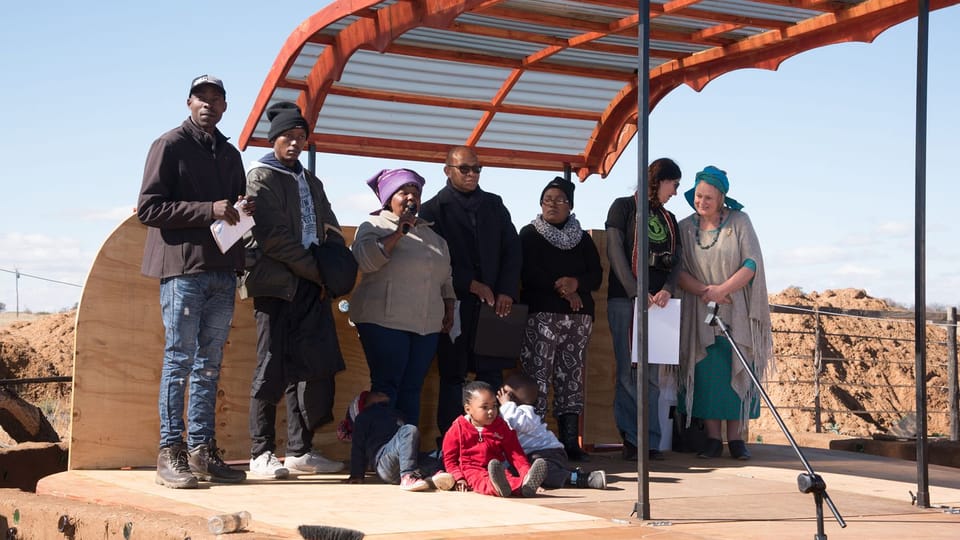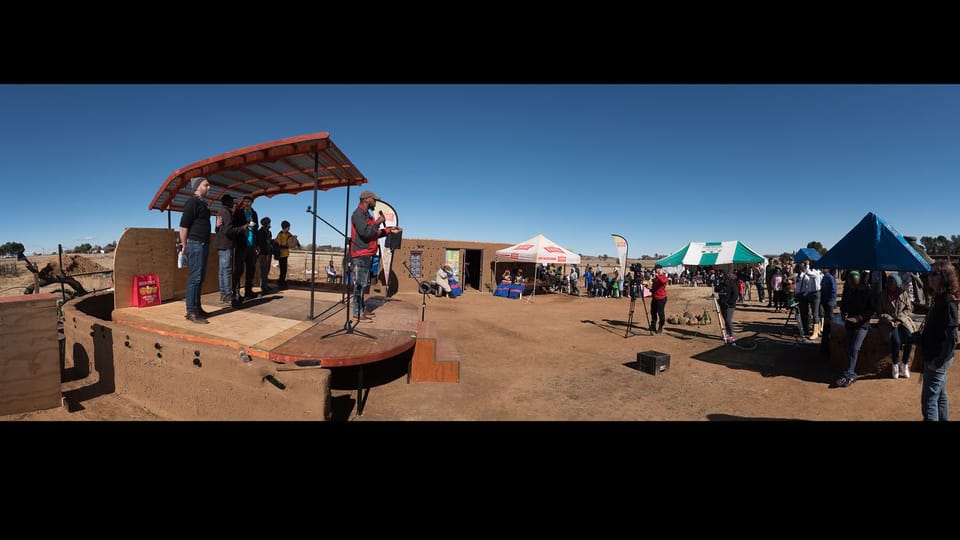 The fourth, offsite Staging Change event was held north of the City of Bloemfontein: the Diversity in Ubuntu Meraka Festival. A Meraka in local Sotho language means a place or veld where people of different cultures come together & share their values. The translation in the Koisan language is ike/xarra/ke which means diverse people unite. This day long community-led celebration of diverse cultural heritages was developed with NPO Start Living Green, led by Anita Venter, building upon achievements & lessons gleaned from our shared work in informal settlements between 2015-18. It involved multiple performances, a marketplace, traditional Basthoto (Lesthoto) horse displays, idea exchanges & building & permaculture demonstrations, all designed to actively share cultural practices between elders & the youths. Following a co-mentoring process we had instigated over preceding years, local resident Mme. Mary Mofana directed the festival, ensuring strong community ownership & empowerment. We also brokered connections to the Pan African Creative Exchange network which exposed her & her performers to leading artists from around the African continent. The festival launched Mme. Mary’s newly-formed NPO we had mentored her to conceive & direct, Lesedi Multi-Purpose Community Development Village, which included a multi-purpose community building constructed from Post Natural building techniques pioneered together in prior projects since 2015. A collaboration MOU was signed with University Free State community affairs department for future sponsorship & the mobile Stage was formally handed over to the community.