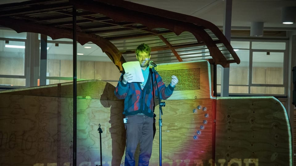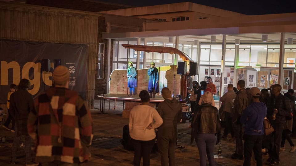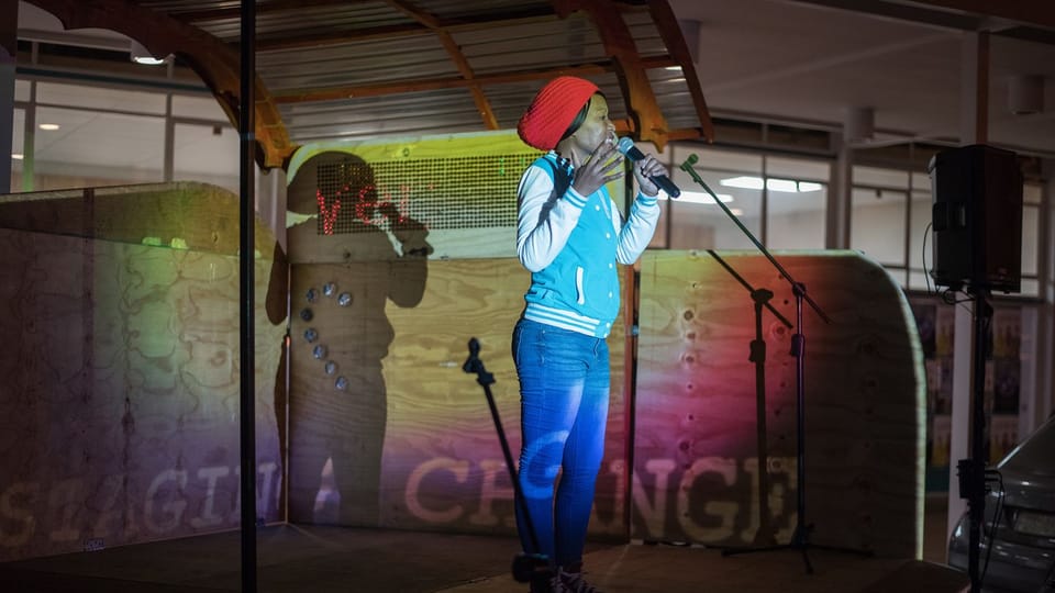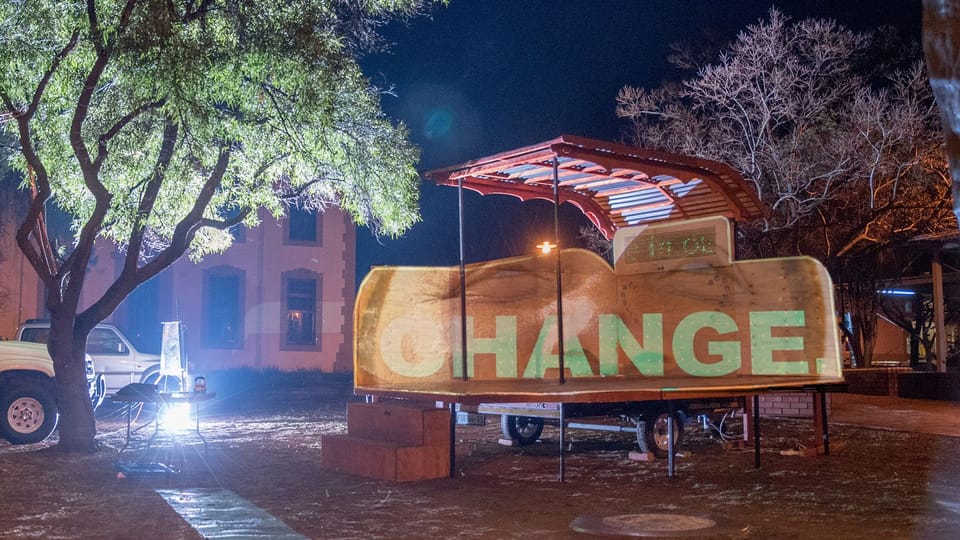 Two audiovisual installations, a poetry slam and a community led festival, curated into the 2018 Vrystaat Kunstefees International Arts Festival/Tsa-Botjhaba, South Africa - Africa’s premier arts festival, featuring significant experimental & public art components. Each event incorporated a mobile stage-cum-artwork as a framing device & performance platform, mapped with realtime video projections, augmented by sound, themed around the African concept of Ubuntu & regenerative futures; speaking to community links, compassion, solidarity & ecological justice. Nobel Laureate Desmond Tutu states, “You can't be human all by yourself, & when you have this quality, Ubuntu, you are known for your generosity”. An accompanying performance poetry slam brought together a large cross-section of the Southern African political poetry community, focussed around Ubuntu, land rights & ecological justice. Staging Change occupied three prominent locations within the festival grounds.