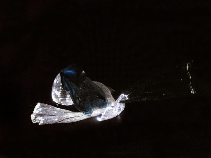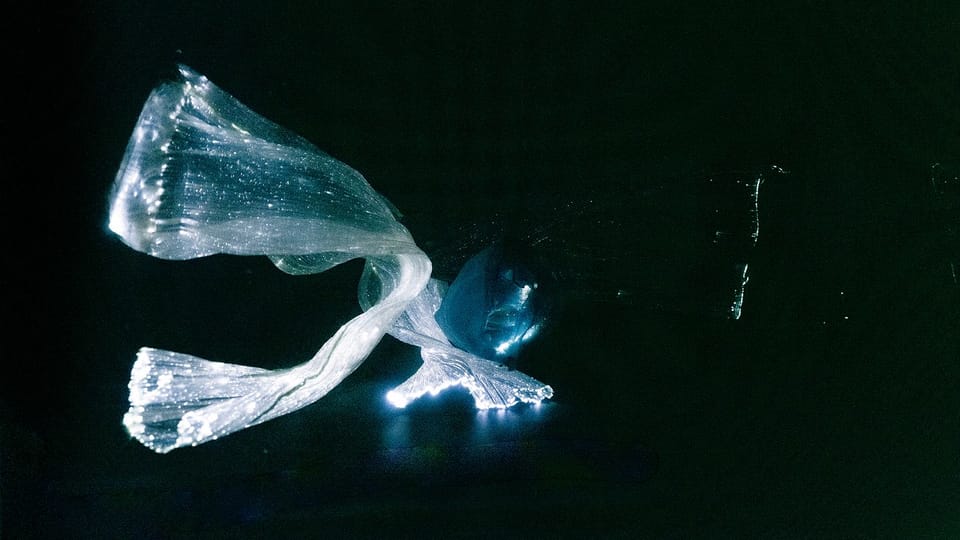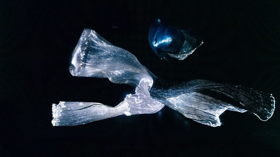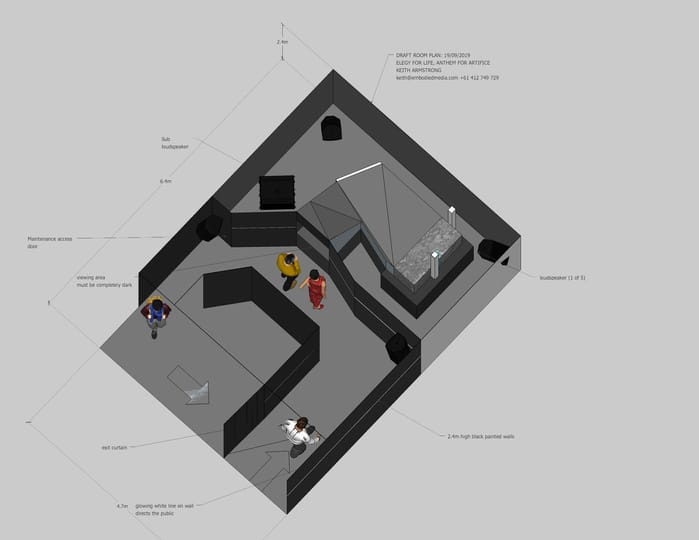 Presented for AS-Helix, The 5th International Art and Science Symposium and Exhibition, The Integration of Art and Science in the Age of Artificial Reality, 2019, the work is viewed from a secret vantage point, where audiences quietly witness a pair of uncanny, ambiguous, life-forms, evolving and performing their private lives, forever entwining and parting ways, safely incubated within a pitch-black void. Seemingly alive and aware, this pair of flowing, rippling intelligences confound, delight, chill and inspire. And at the same time their powerful sounds echo and reverberate around the space, evolving wave upon wave: building the elegy soundtrack for our ‘old life’, re-imagined anew - in a powerful ‘anthem for artifice’.