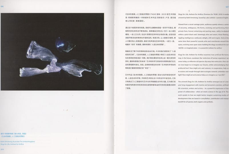 The artwork Elegy for Life: Anthem for Artifice emerged out of a ten year long engagement with marine and terrestrial scientists, artificial life scientists, writers and artists – in a powerful expression of the power of collaboration - when art meets science in the age of AI. The work speaks to how we might better imagine sustaining modes of development that are based in consultation, contribution and mutual benefit for all species, both organic and synthetic.