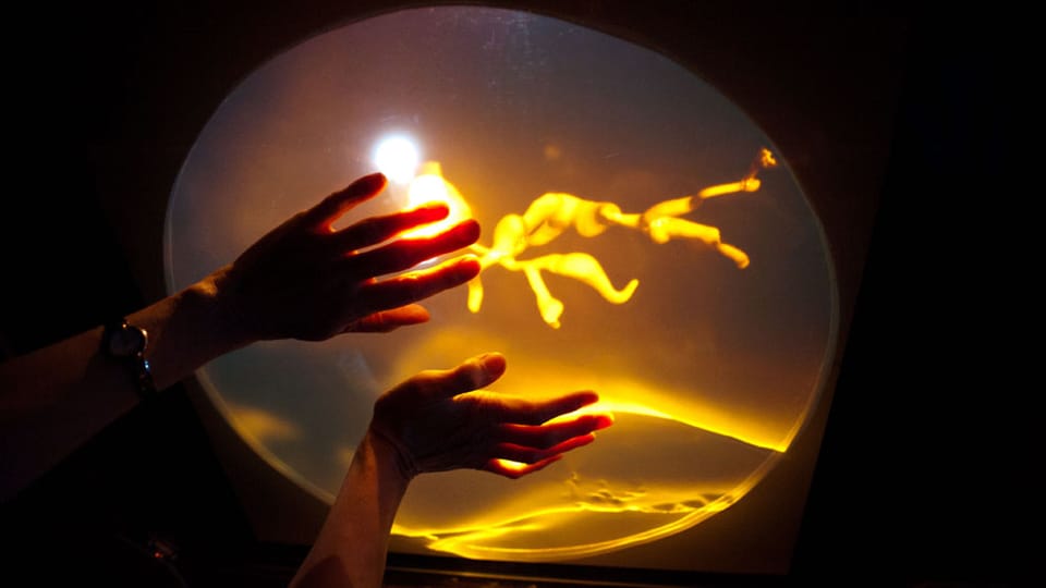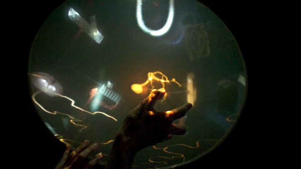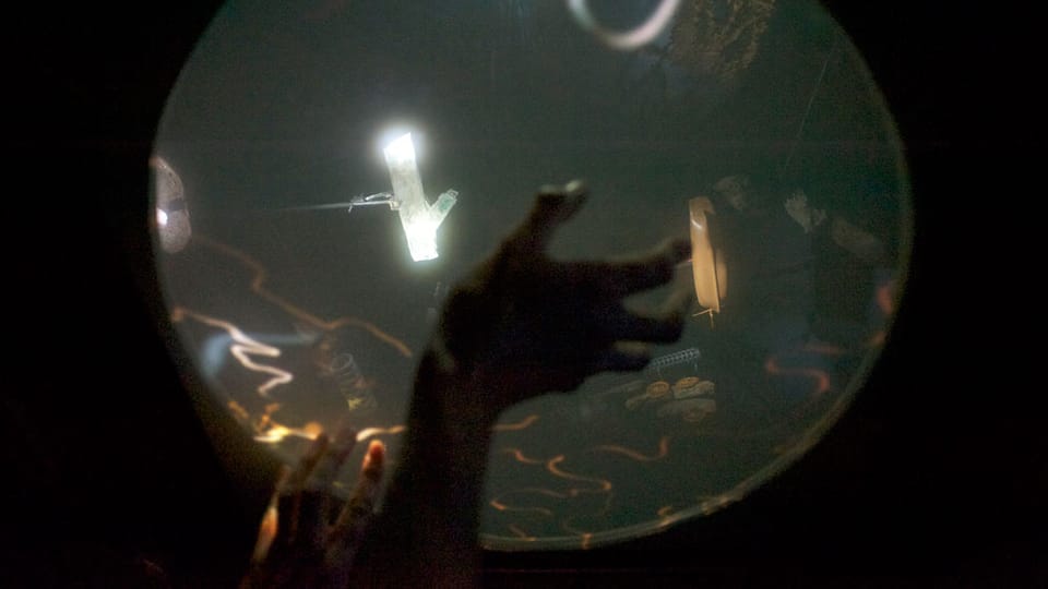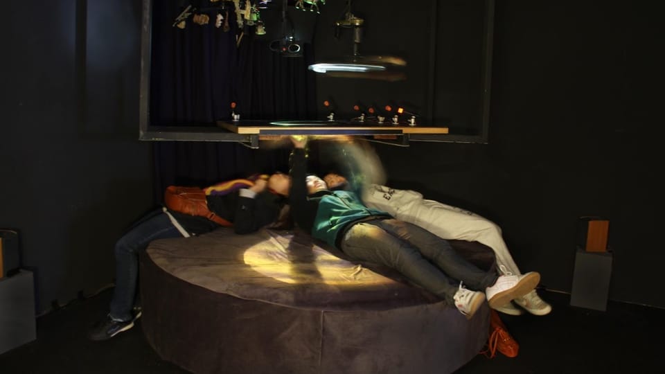 Through subtle, non-didactic touch-sensitive interactivity the participant then has influence over both the 3D graphic imagery, the physical movements of the diorama and the 4 channel immersive soundscape, creating an uncanny blend of physical and virtual media. Five speakers positioned around the room deliver a rich interactive soundscape that responds both audibly and physically to interactions.