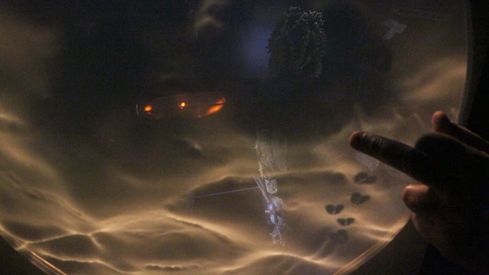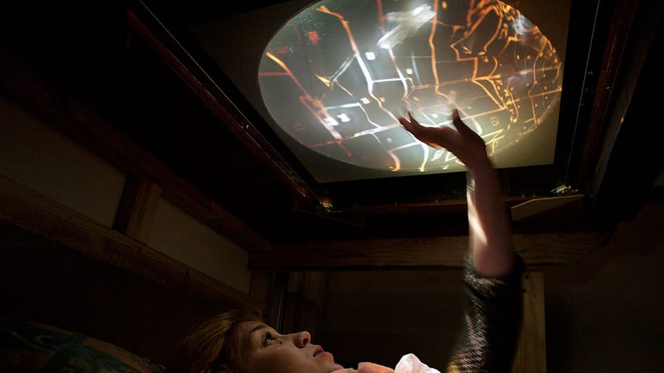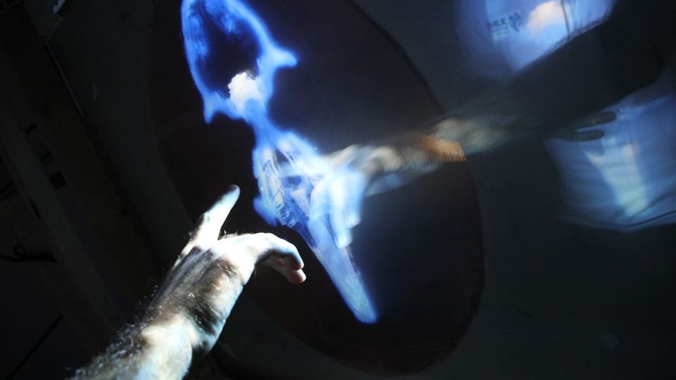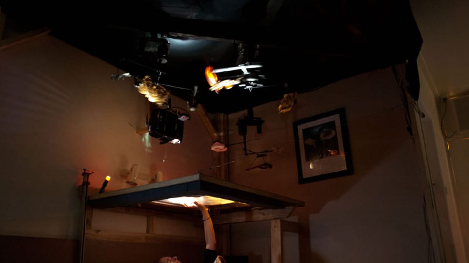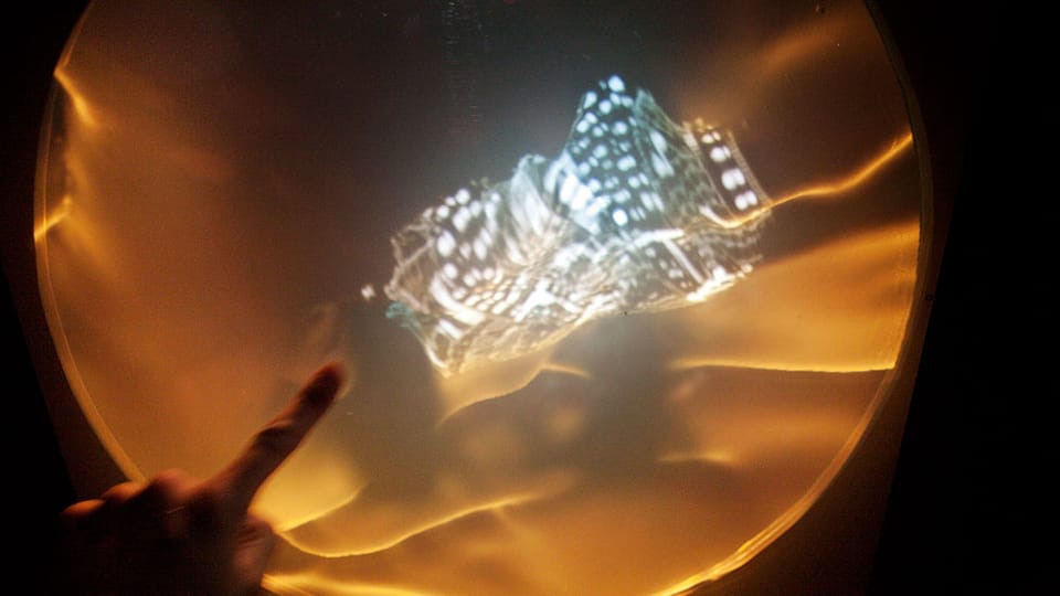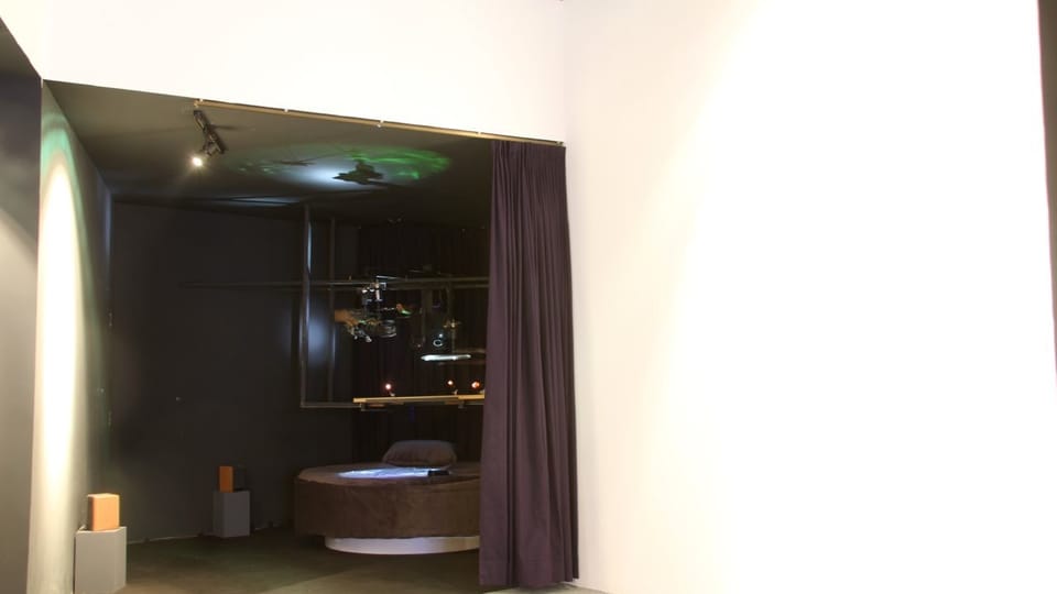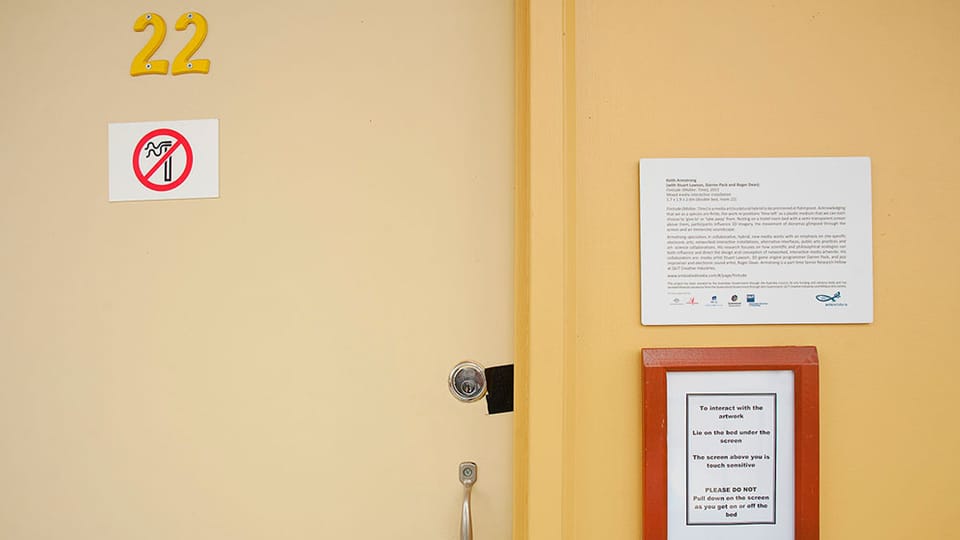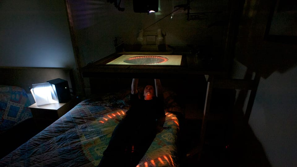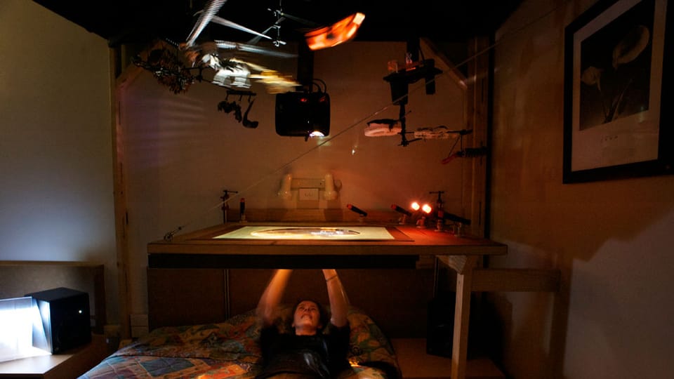 Finitude (Mallee:Time) is a major new media/sculptural hybrid work premiered in 2011 in version 1 at the Ka-rama Motel for the Mildura Palimpsest #8 ('Collaborators and Saboteurs'). Version 2 was shown at Gallery Artisan, Brisbane in May-June 2012. Each participant/viewer lies comfortably on their back. Directly above them is a semi-transparent Perspex screen that displays projected 3D imagery and is simultaneously sensitive to the lightest of finger touches. Depending upon the ever changing qualities of the projected image on this screen the participant can see through its surface to a series of physical dioramas suspended above, lit by subtle LED spotlighting. This diorama consists of a slowly rotating series of physical environments, which also include several animatronic components, allowing the realtime composition of whimsical ‘landscapes’ of both 'real' and 'virtual' media.