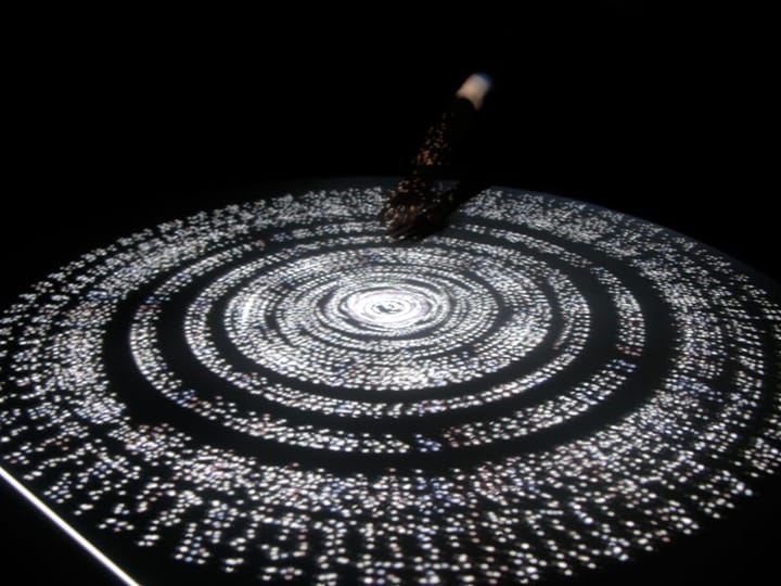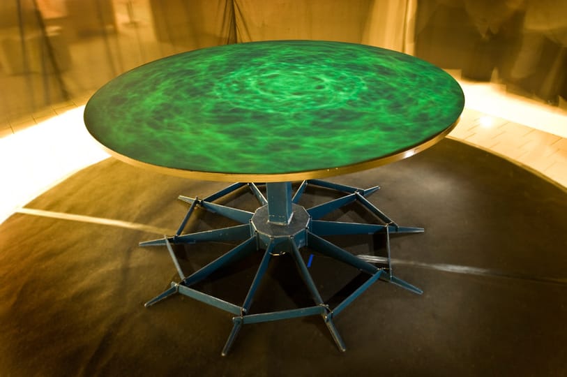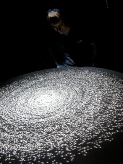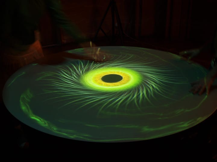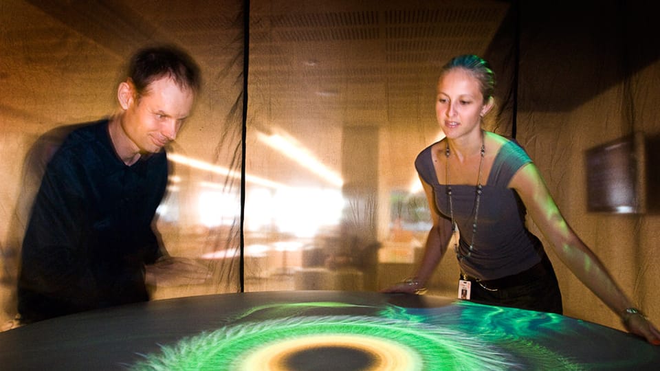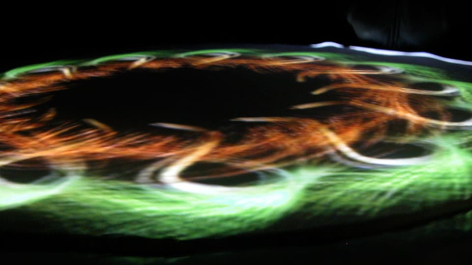 An embodied interactive installation investigating the cultural dimensions of sustainability. A large circular table spun by hand and a computer-controlled video projection falls on its top, creating an uncanny blend of physical object and virtual media. Participants’ presence around the table and how they touch it is registered, allowing up to five people to collaboratively ‘play’ this deeply immersive audiovisual work.