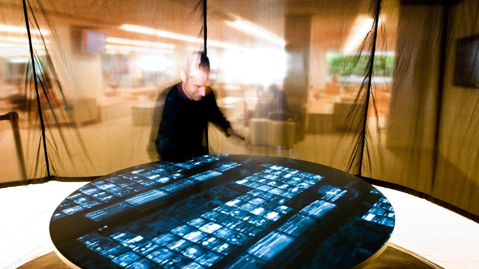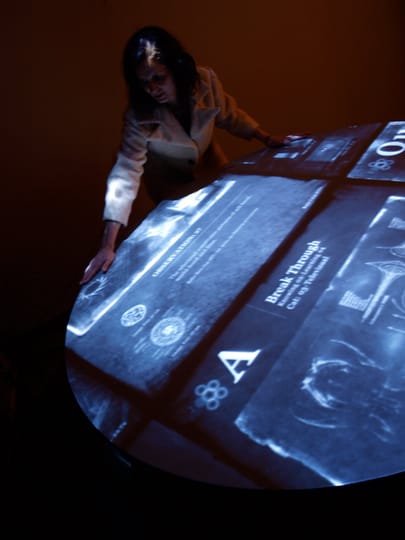 MORE: In an age that has come to celebrate cultural difference Knowmore (House of Commons) considers the urgent need for us to also better celebrate and care for that which we share in common: the cultural and biophysical environments that fundamentally sustain all life today. This critical shift in thinking and action requires us each to envision new ways to re-orientate our everyday life choices in ways that better respect that which is shared by all: 'The Commons'. The work therefore asks what kind of resources and knowledge might be necessary to move us past simply knowing what needs to be changed to instead actually embodying that change. It further suggests this idea by focusing on the power of embodied learning implied by the works' strongly physical interface (i.e. the spinning of a full size table) alongside the complex field of layered imagery appearing upon that table top which hints at other deeply relational ways of understanding and knowing the world.