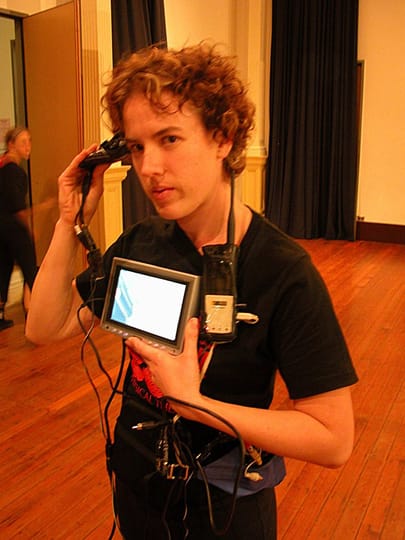 A large-scale location based promenade performance work produced by renowned physical theatre company Zen Zen Zo. Themed around the experiences and ethical dilemmas inherent within contemporary computer gaming scenarios it utilized a dramatic combination of multimedia scenography and audience-performer choreography to profoundly challenge numerous conventions of contemporary performance. Technologies deployed included augmented reality mediatised sets and locations as well as the extensive use of wearable, portable and wireless systems. Audiences became central participants within the work’s creative processes and were taken on an immersive journey via numerous sets distributed throughout buildings, their environs and a private house. As multimedia director my role was to work in close collaboration with the directors and players to create visual materials, wearable computing and imaging devices, computer surveillance systems, wide area audio broadcasting and bugging and surveillance solutions. The production was hugely successful selling out every performance of its run and producing strong and vibrant reactions from its diverse audiences.