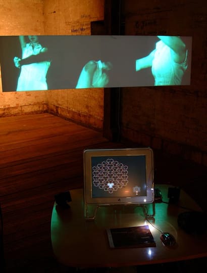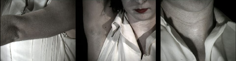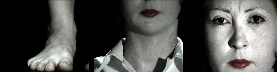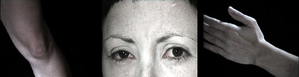 MORE: Transact (Flesh/Skin/Bone) was a three screen interactive video installation for a single user with a visual interface based upon the tessellated, interlocking honeycomb structures commonly found in biophysical lifeforms. Participants could navigate the work by ‘moving’ along numerous differing paths through the cellular script, thereby creating unique combinations of video triptych material that featured minimal performance actions by Lisa O’Neill. The work was accompanied by an interactive stereo sound-scape experienced via headphones and a full colour book that detailed the research behind the work.