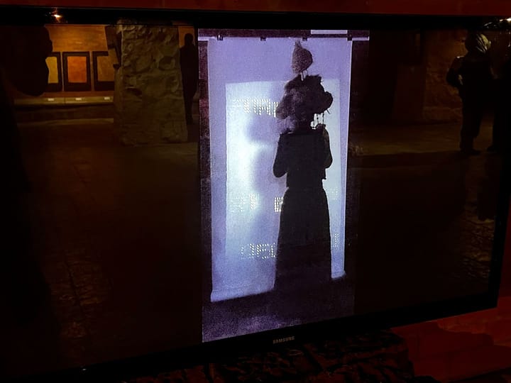 During the unfolding of the performance, Sonya intuitively collaborated with Busisiwe's voice, only moving upon hearing her undulations which were interspersed with Pitika's poem, thereby allowing Busisiwe to directly influence her navigation. As Sonya intermittently started directing her movements towards Busisiwe, she eventually confronted 'herself' (her projected shadow gram) also moving towards herself. Creating a 40-second moment of stand-still tension, Sonya removed her weaver-bird headdress, thereby revealing her own vulnerability.